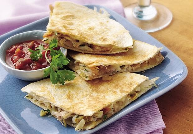 Mix the chicken and salsa in small bowl. Add the quesadilla seasoning and 30ml water. Top with another tortilla then mist the.